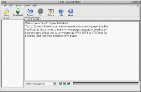 Text to Speech Maker is an award-winning text-to-speech player that lets you listen to documents, e-mails or web pages instead of reading on screen. Text to Speech Maker it also allows you to convert text to WAV,MP3 or VOX files for listening later with your portable MP3 player. Text to Speech Maker supports dozens of female, male and robotic voices for Britain English, German and French.